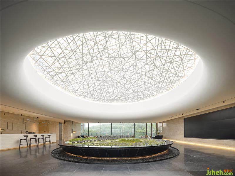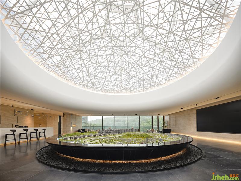沙盘区整齐有序,端庄素净,透过穹顶散落的自然光与室内灯光的结合,折射出空间的宽阔硬朗、勃勃生机。