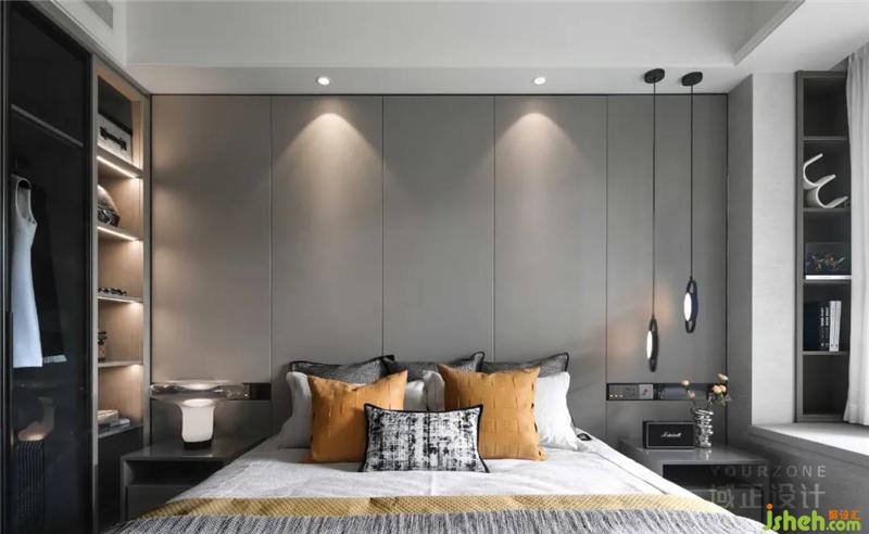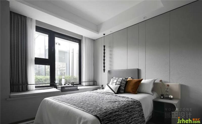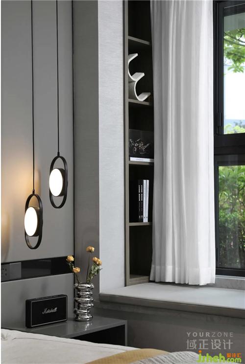 主卧通过软装颜色的精心搭配,墙面线条的走向,以表达居者追求仪式感和生活情调的心境为基础,上海样板房设计将低调有内涵的气质展现的淋漓尽致。