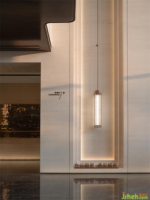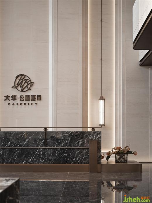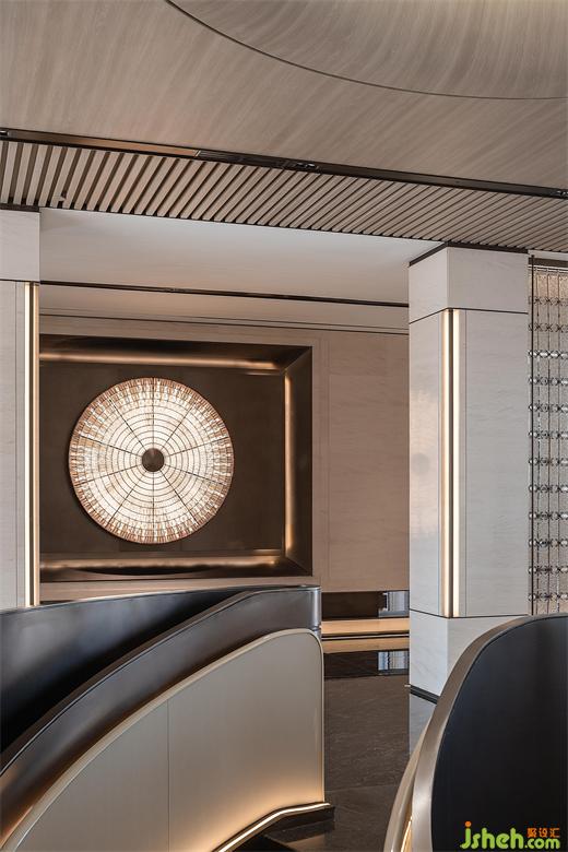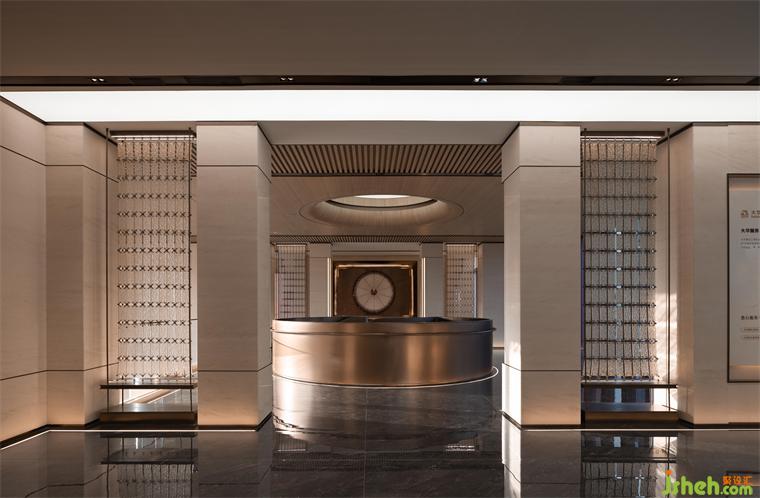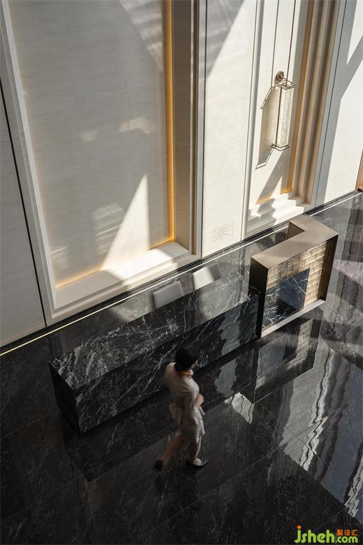 往空间之中深入,接待台典雅的石纹与内敛的支杆金属组合就像画卷般令人感到静谧,壁灯柔和的光源轻柔流畅的从身上落下,照亮接待台的台面,正式开启此次体验之旅。