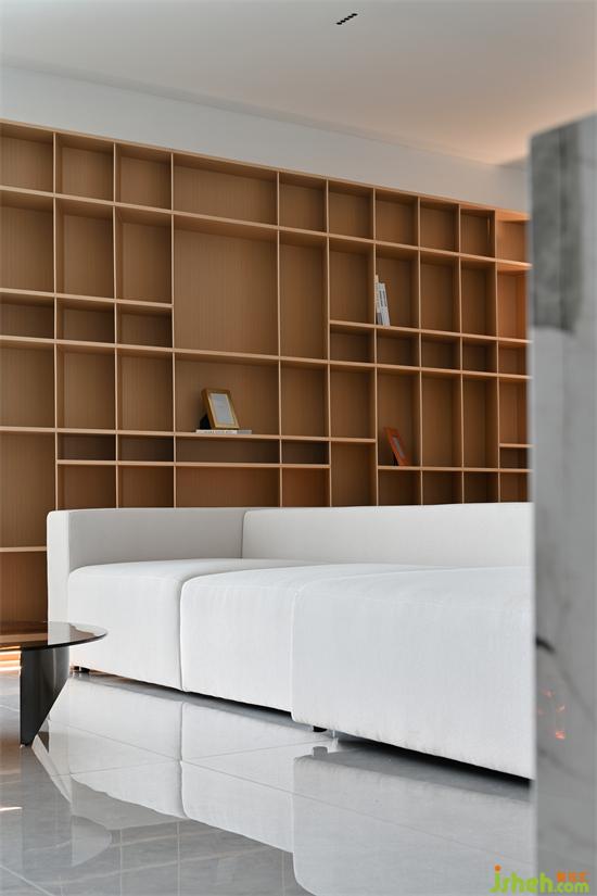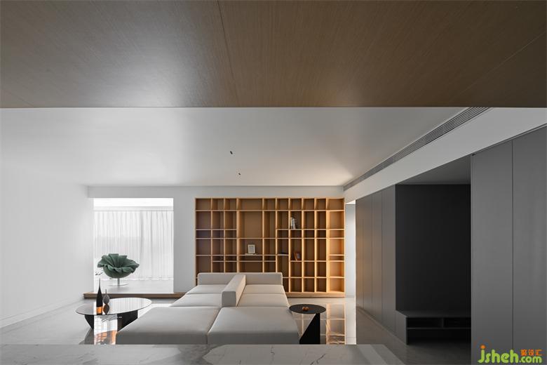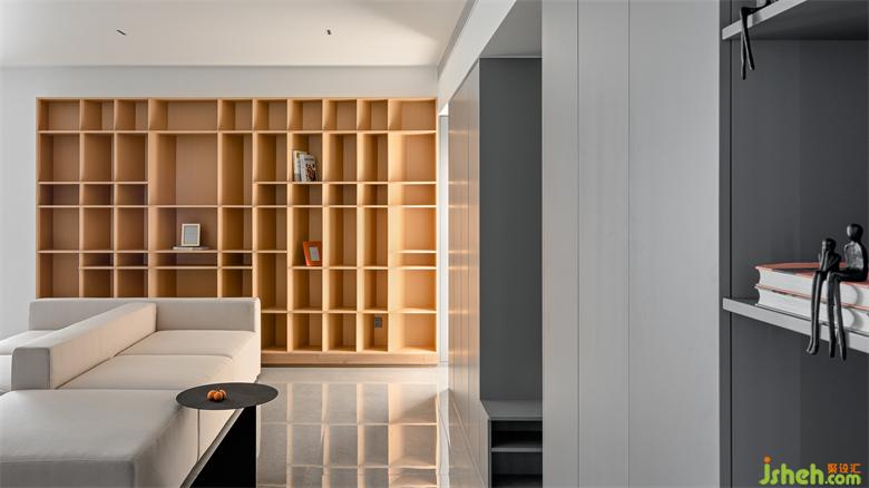 客厅的设计就以灰白作为主基调,木色以立柜形式插入其间。室内设计师木色的柜体也让空间多了些自然的肤色,色块的简化,简雅的视觉明度,加之木质特有的柔和,室内设计师使居室内的情绪沉稳放松。