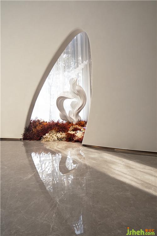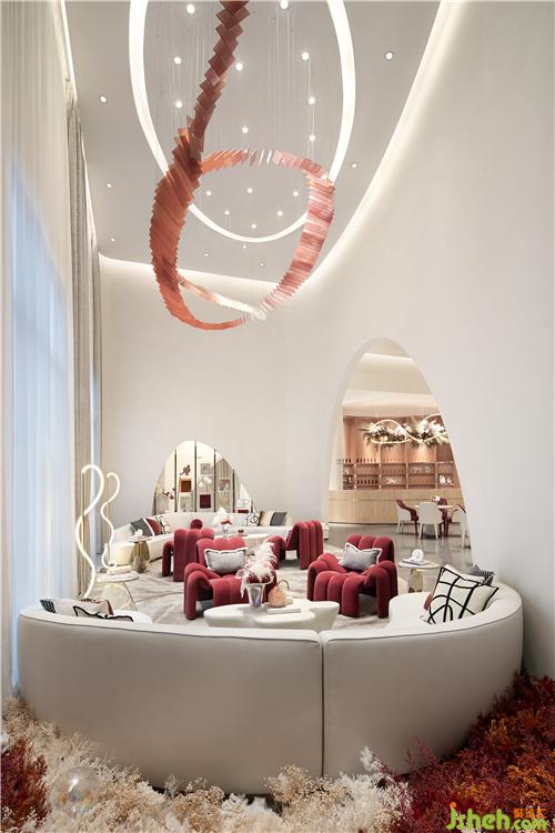 活力的赤红作为点缀,以抽象的花瓣形态传递花海的繁盛意境,引入“花语春色”的诗意体验,寓意城市的复苏寓意,营造一种安静、岁月静好的体验感武汉售楼处设计。