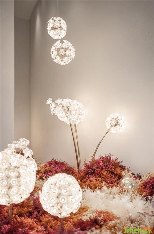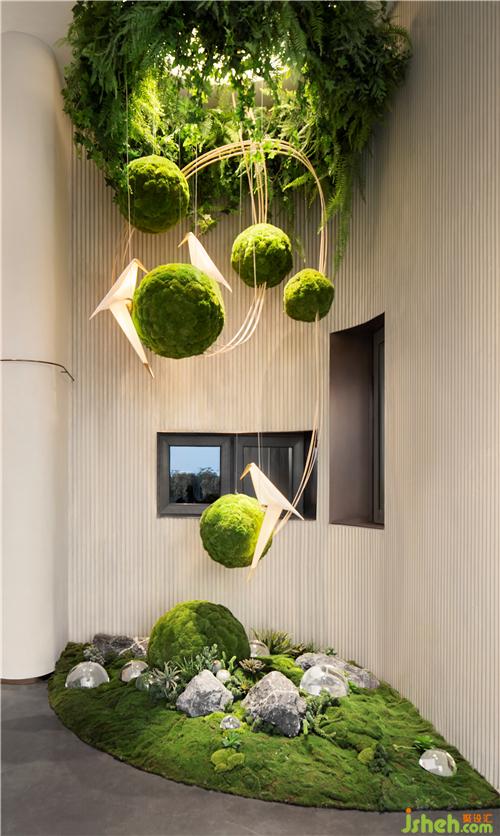 穿过过道展开生活新篇章,植物圆球装置以跳跃的色彩与生活共舞,简约的空间中孕育着自然诗意,传达未来生活的自然和谐与美好。