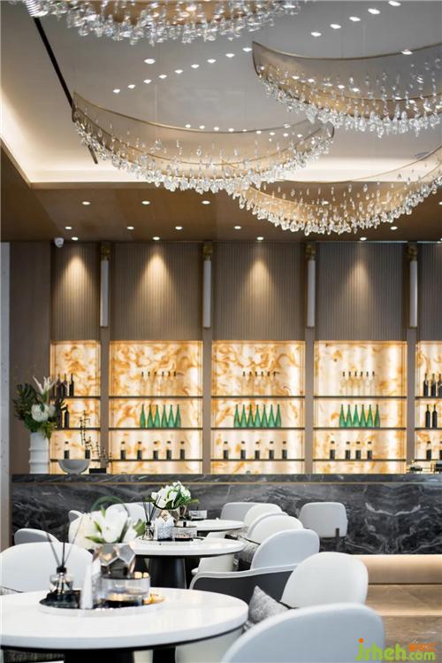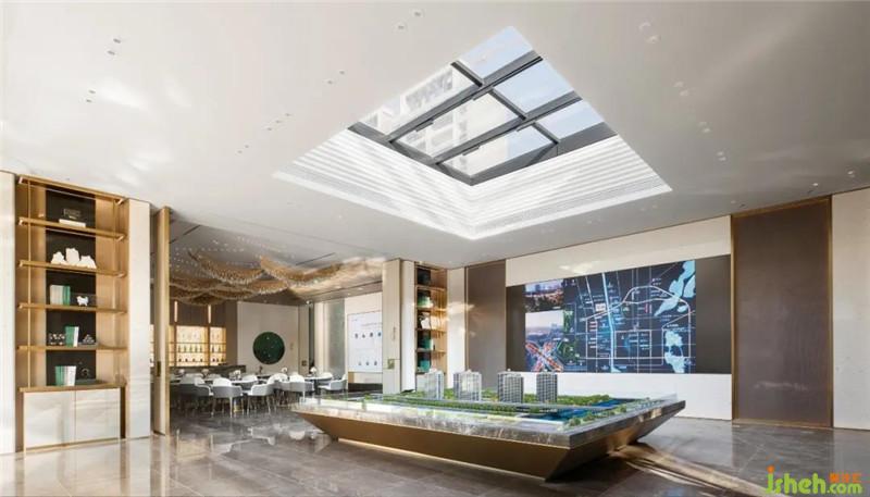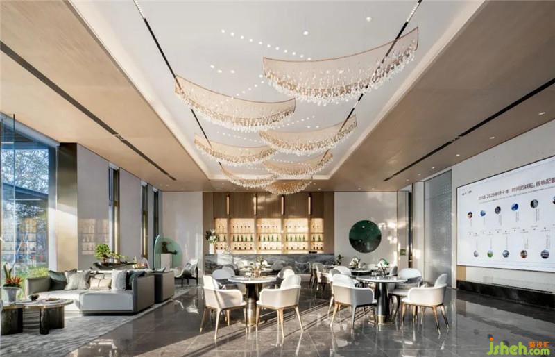 空间以艺术端景,巧用吊灯与石材地面的光影变幻 , 呈现湖池水的波光 、涟漪 , 从而强化参观者在空间的情境体验 。以自然叙事,元素的演变与再塑融入空间,营造繁华之中文脉沉淀与栖息的愉悦居所苏州售楼处设计。