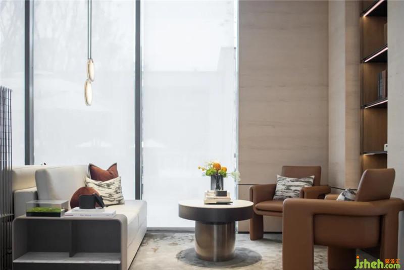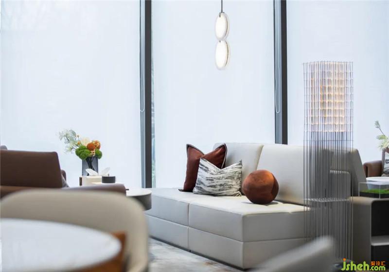 大面的落地窗户将室外自然水景最大引入,在光线的折射下构筑自然与室内、与人之间的观感互动。