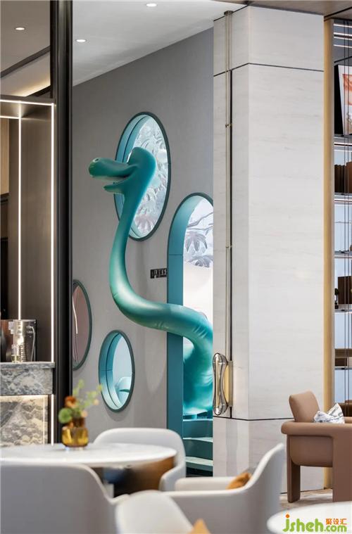 儿童区以趣味的恐龙世界,为都市的繁忙之余开辟一丝温暖与童趣;回应东原人文关怀.趣味的人机互动增加了人与空间的交互,情景化的打造让这般简单的童趣互动在此形成了景中景,还原孩子童真的一面深圳售楼处设计。