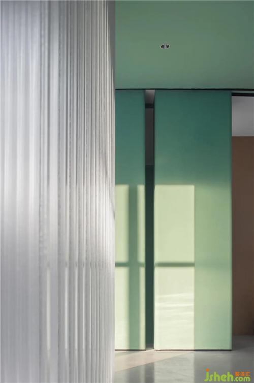 画面转移至沙盘区,空间以半透明材质的亚克力作为帘幕一般的隔断,深圳售楼处设计分隔了空间也分隔了前厅与洽谈区域的情绪体验,呈现出都市繁华与休闲生活的转换的“动”与“静”。