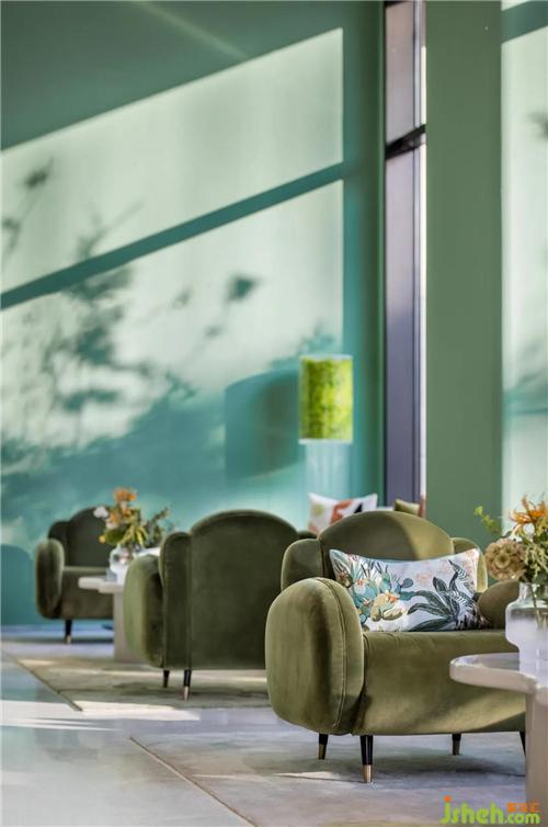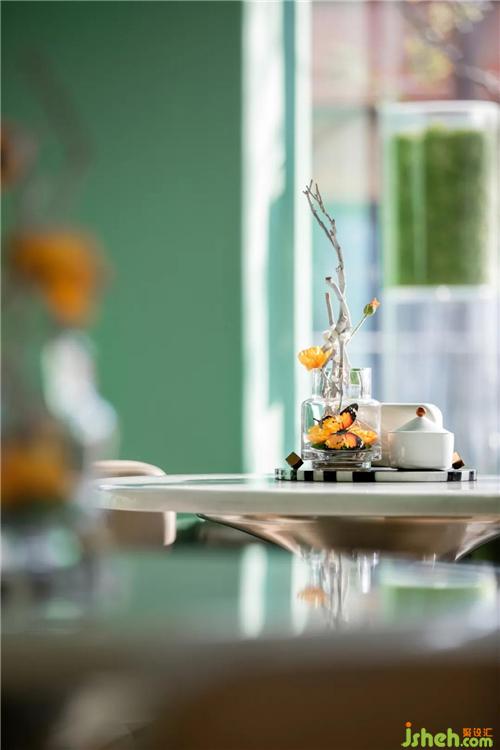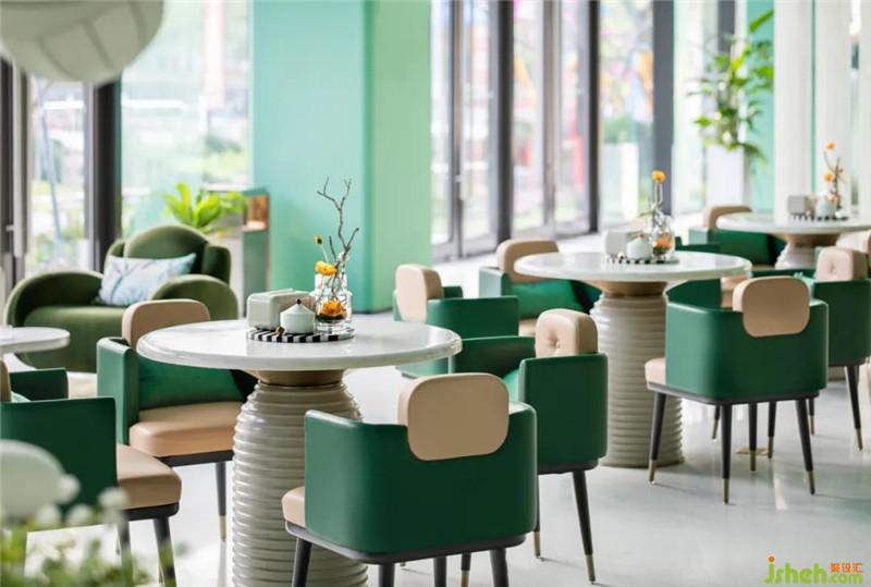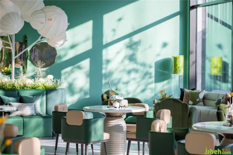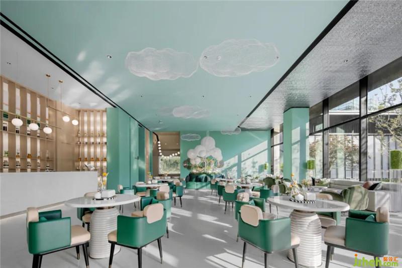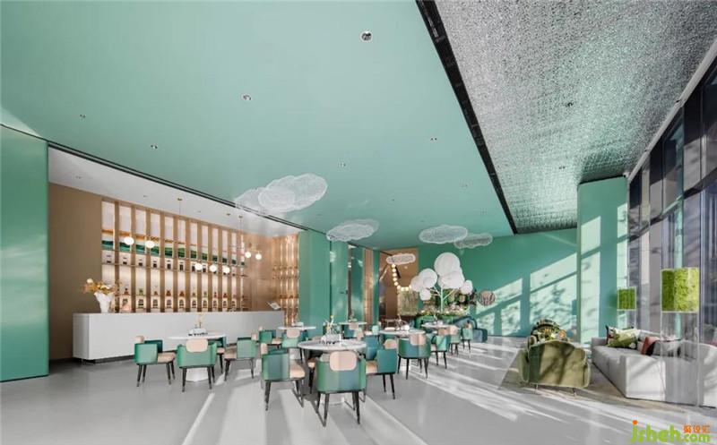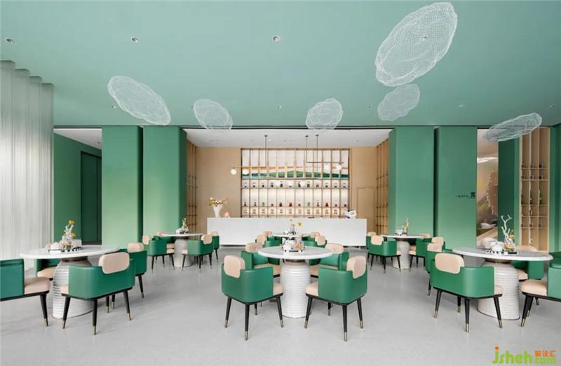 水吧区金属的线条与墨绿相呼应,体现现代都市生活对品质感的追求,垂吊的灯饰让人仿若置身梦幻世界;在当下快节奏的都市生活中,我们想通过空间拉近人与人之间的互动,增添人情温暖。