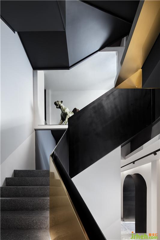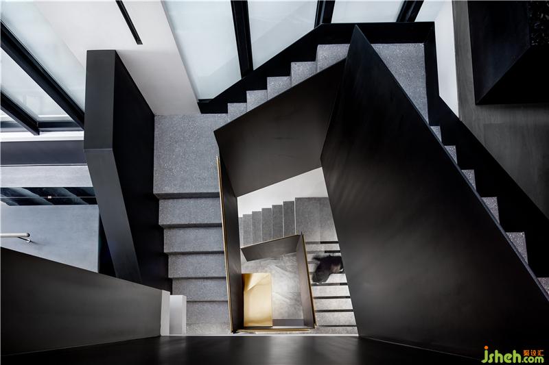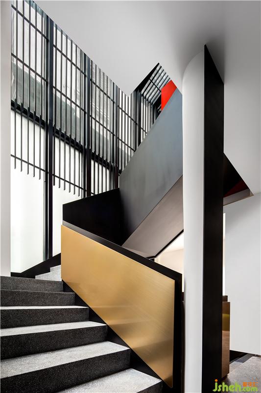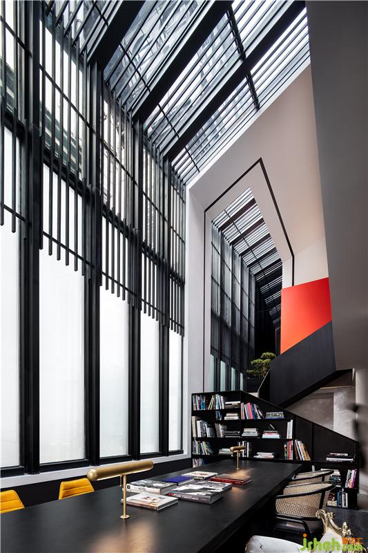 这处中庭景观楼梯所在位置是老房子的电梯厅,Gary将电梯挪动至房屋的后侧,将此处空间解放出来,楼梯也就顺势变成了一种景观。