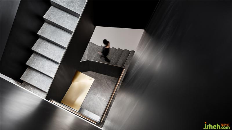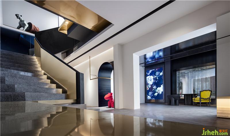 在二楼和三楼之间还置入了悬空的红色箱体,作为收尾。整个空间变得有意思起来:金属、石材、布艺,私密与开放兼具,营造一种极致的美学体验。