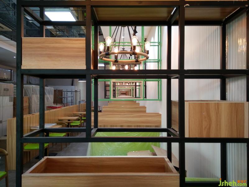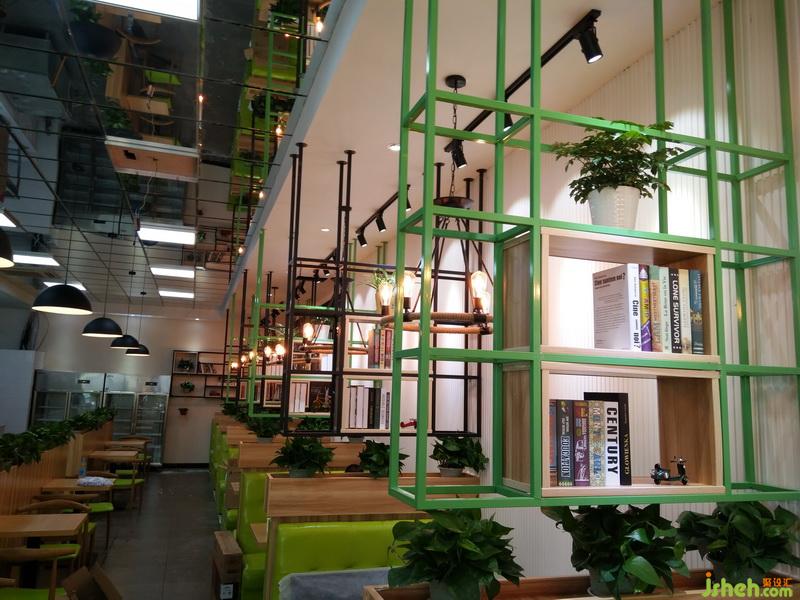 雅座区上方绿色装饰架,呈阵列排布,划分空间同时增加空间层次与艺术美感,吊顶中间银镜装饰,拉伸空间同时增加魔幻与现代时尚感。顶面高色温LED平板灯,墙面高色温滑轨射灯以及就餐区上方低色温吊灯,冷暖对比,层次分明,整体灯光给空间增加了蓬勃的生气。室内设计师