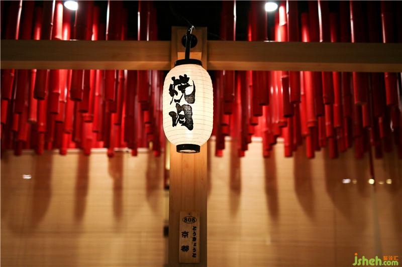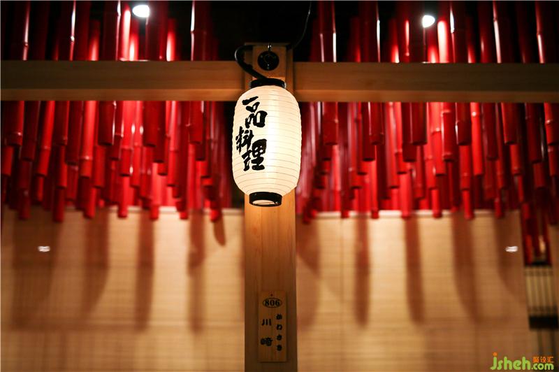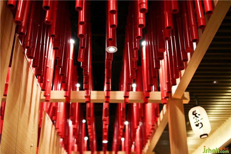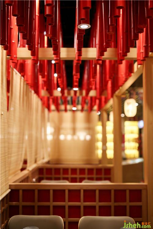 大红的油漆呈现出金属般的质感,整齐的排序又显现出极强的秩序感,把筒灯插入竹子空隙当中,形成自然的明暗光影变幻,红竹与竹帘互相呼应,营造出禅境和喜庆祥和的氛围,提升就餐区品味和格调。
