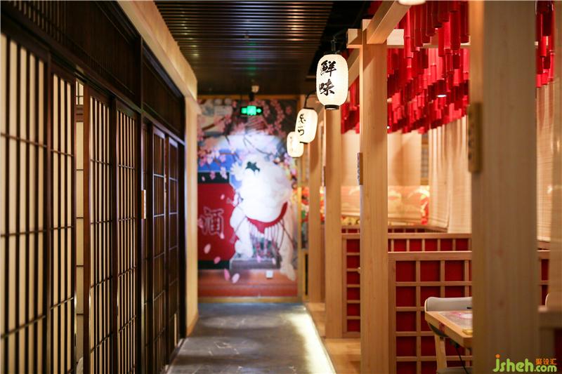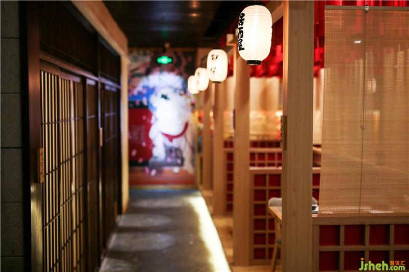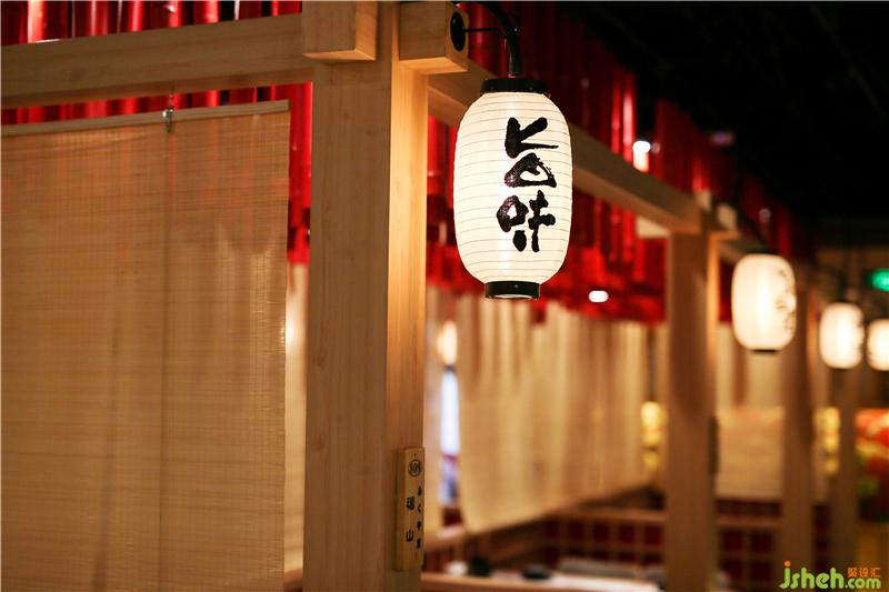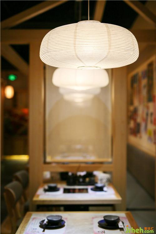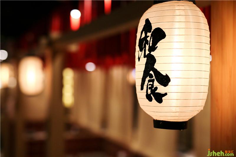 对于门口整体缺少氛围感,略显冷清这样的不足,设计师通过增加灯笼、樱花树、白石子、海浪石、地灯等软装营造氛围。灯光亮起,透出静谧浓郁的日式氛围,随处可见的小设计让整个空间充满着日式的传统色彩,林深时见鹿,海蓝时见鲸,一个个日式灯笼高高挂起,恍惚间便觉得是置身于浪漫的京都一般。餐厅设计