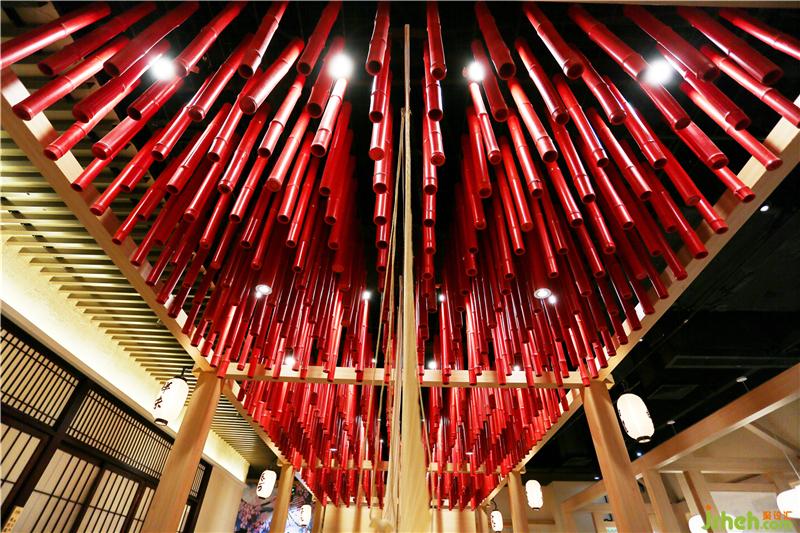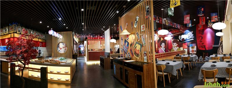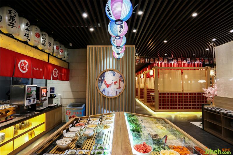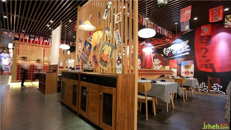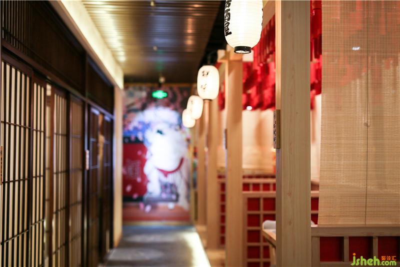 中间做了地台,设雅座就餐区,木质的结构,人字顶的顶部设计,营造出了日本木屋和古道长亭的意境。