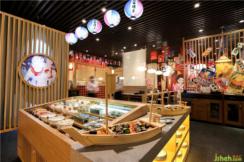 文化符号是文化的抽象表现,也是载体和形式。一侧的海报墙,浮世绘画作、商业海报、樱花、和服、相扑等元素杂而不乱,让客人在就餐之余,抬头就能感受到浓郁的日式文化,仿佛穿行于时空,走在川流不息的京都街道,从窄巷里的深夜食堂,感受到食物带来的美好。餐厅设计