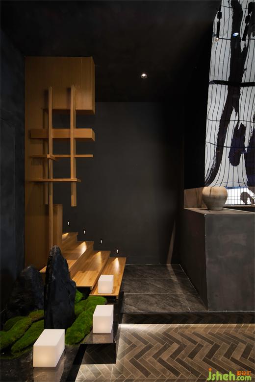 一楼楼梯处,一座山景,大小分明,高低错落,自由灵动,粗糙石材与精致木材碰撞形成视觉焦点。黑色透明亚克力为城,围着一株姿态灵动的花木,花木无言,自述淡雅闲情。
