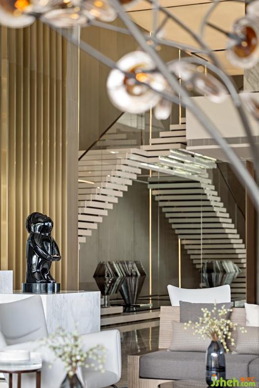 围合式的休息区,传达出轻松气氛,饰品摆件,不经意间彰显沉稳。延续而来的艺术装置似音符般飘过,点一杯咖啡落座其中,即可享受惬意时光,落地窗外的景色汇于室内形成虚实对比。家具造型简洁明快、实用大方,因 “现代主义”的生活哲学普遍存在于当今大众流行文化中,依靠新材料、新技术加上光与影的无穷变化,追求无常规的空间解构,大胆鲜明对比。强烈的色彩布置,以及刚柔并举的选材搭配,碰撞出独一无二的时尚。