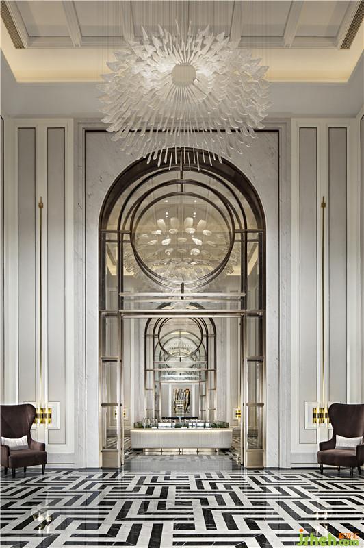 顶部的艺术装置灵感源自于天津市月季花,用自然形的花朵,涵盖了自然优美的艺术形态,在硬朗的空间中增添了一丝典雅柔和的气氛。