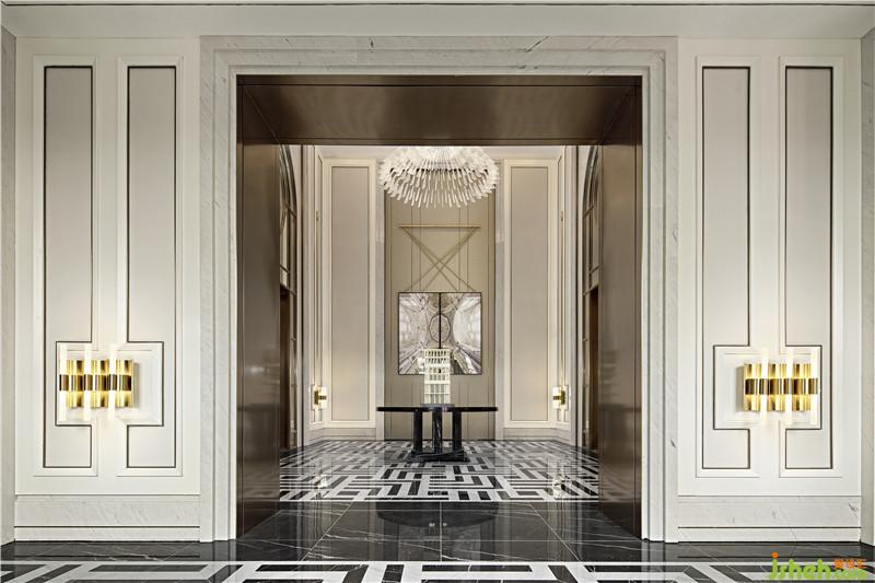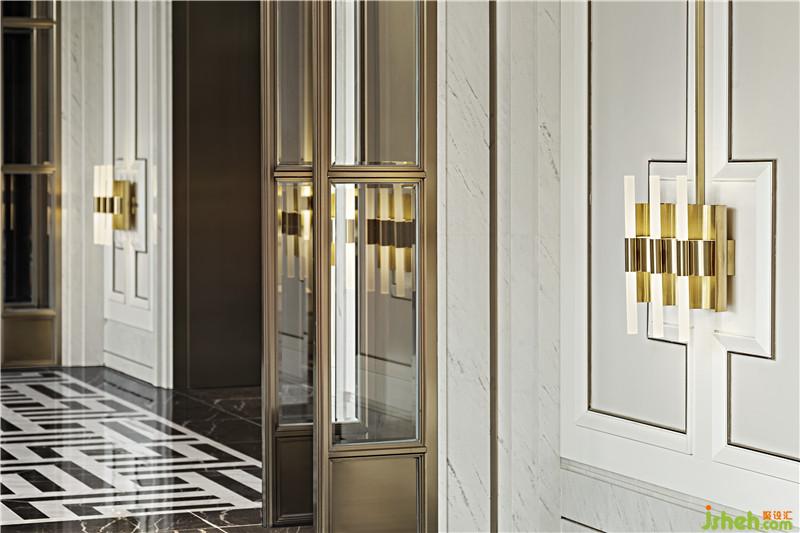 主要材料:古铜拉丝不锈钢、雅士白大理石、烤漆板、拼花地砖、皮革硬包等