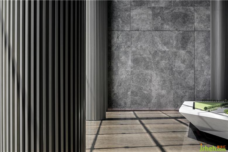 主要材料| 意大利灰皮革面石材、美国木纹大理石、蓝金沙大理石、定制古铜不锈钢造型板、铝格栅板、染色柚木木饰面、杜邦可丽耐等