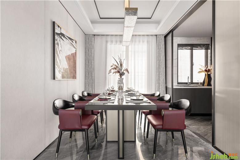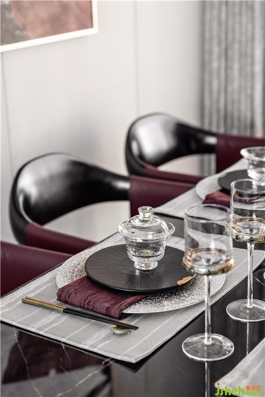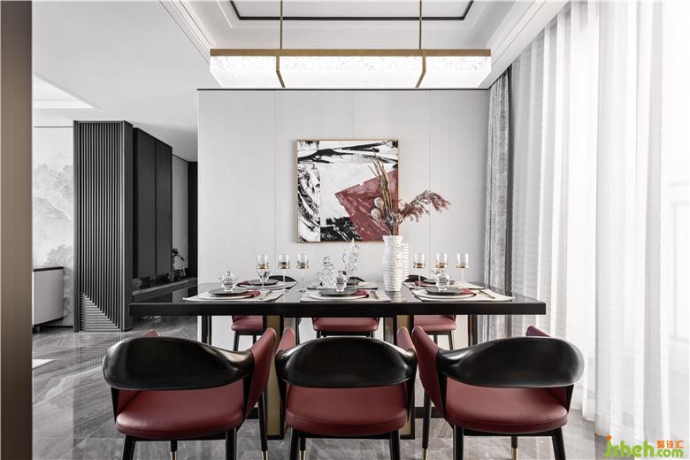 餐厅延续客厅配色以及材质,顶部灯具采用棋盘式意境形态,心平气和谦让有度的大气氛围在此弥漫开来。