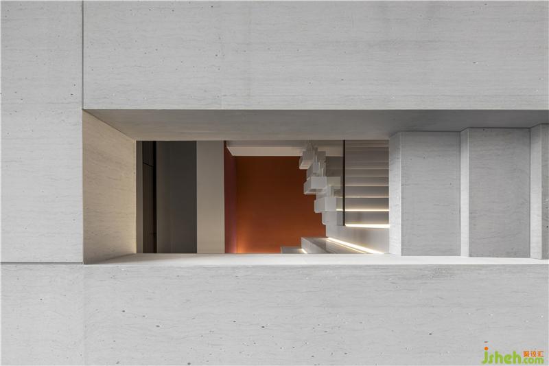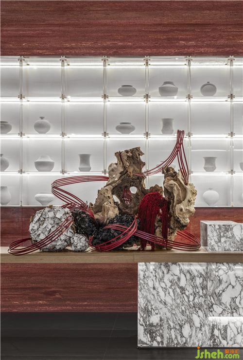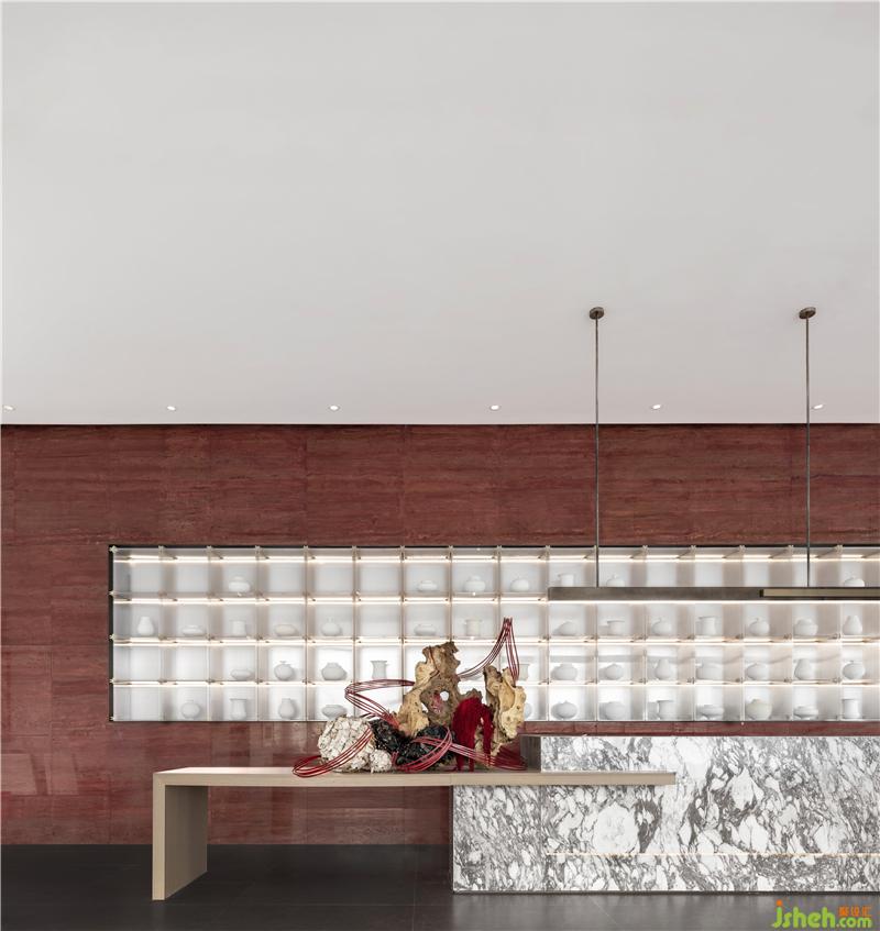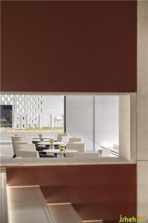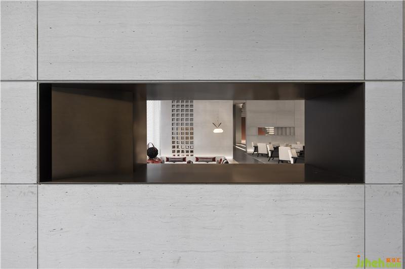 主要材料 | 红洞石、水泥板、白色人造石、雪花白大理石、木饰面、古铜拉丝不锈钢、阳光板等