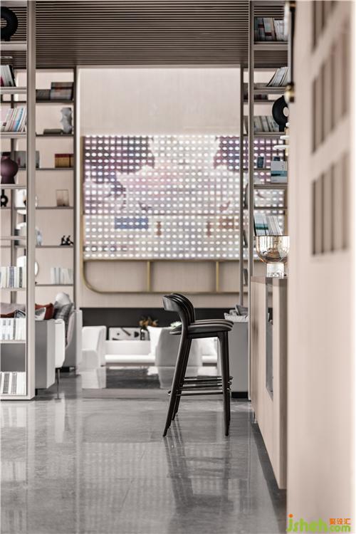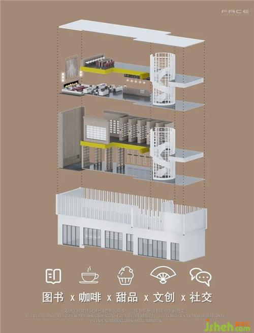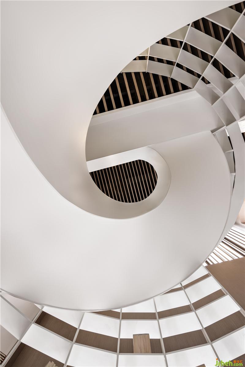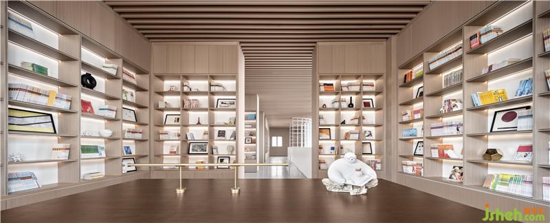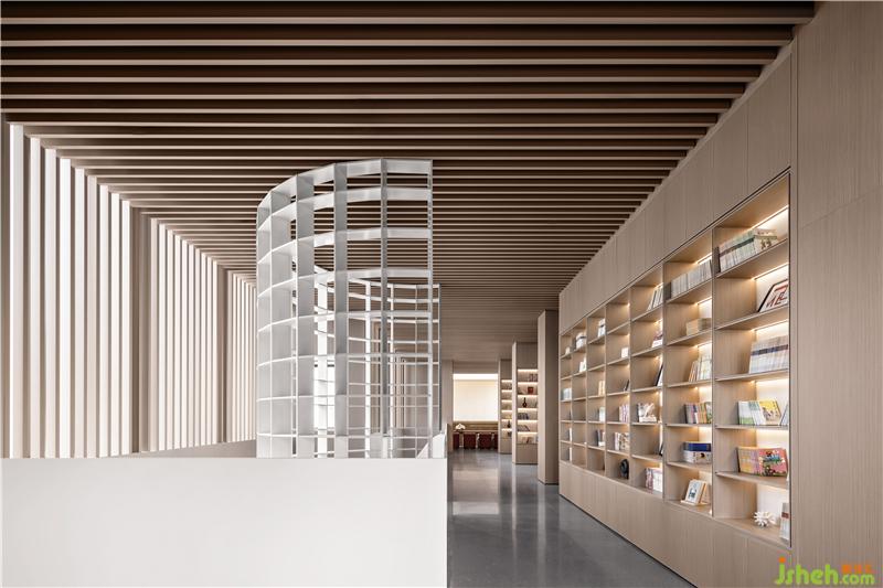 书架造型呈现浓厚书卷气,艺术楼梯结构棱角分明,文创店铺设计连接上下两层,使空间更具延伸与通透感。
