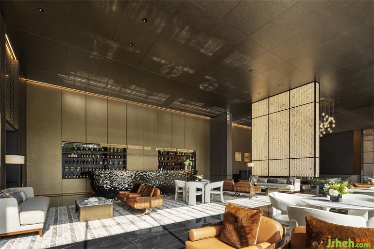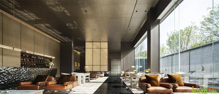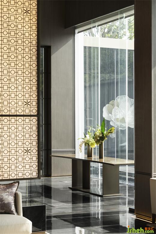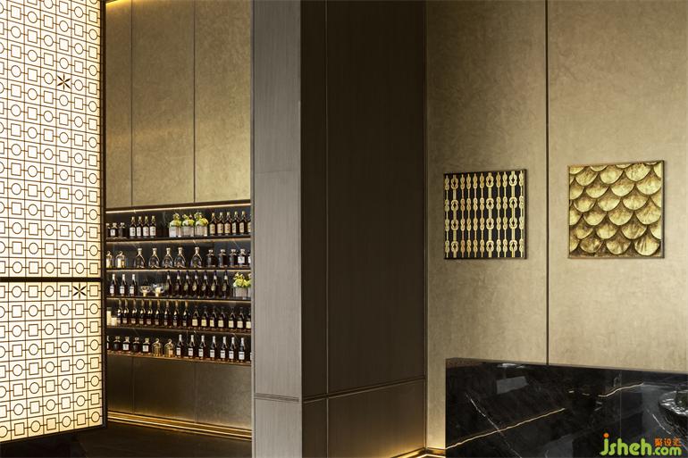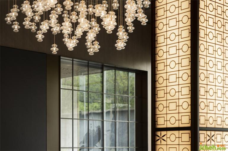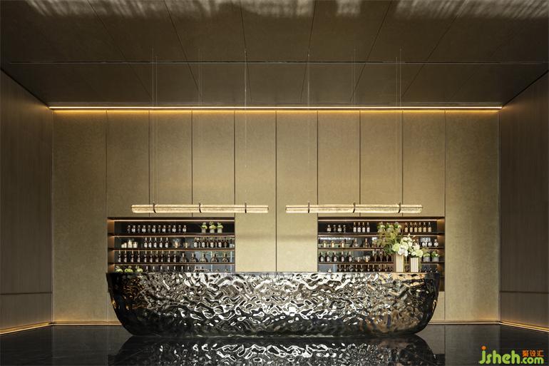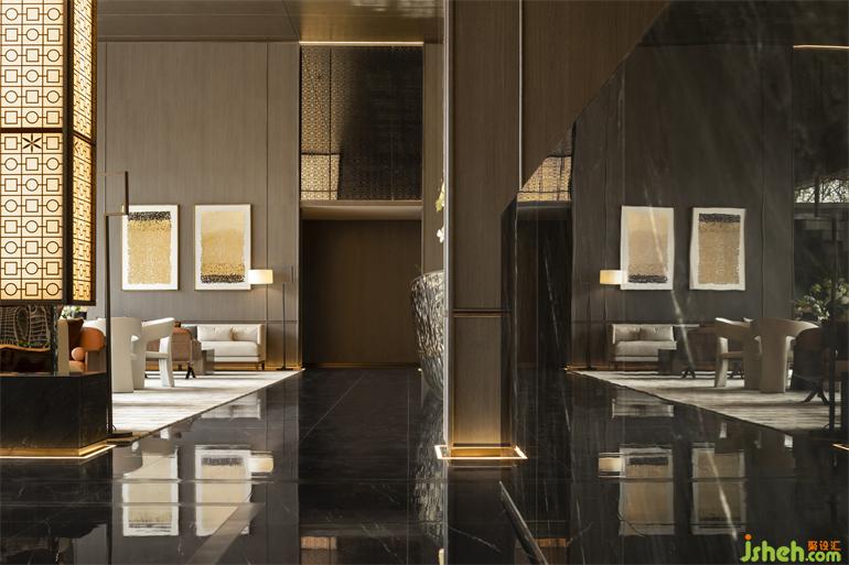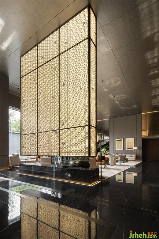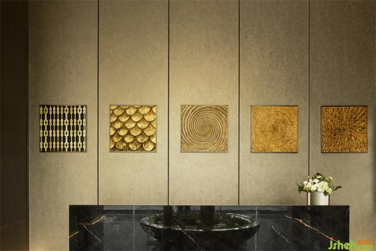 由宁波市市花山茶花演变而来的云石灯箱花纹,简约的序列视觉感让空间立体纯粹,光线的扩散使氛围增感强,平静优雅之余,亦多了一种光影和结构的表现。售楼处设计在黑与金的加持下,纯粹精致感映入场景内核。