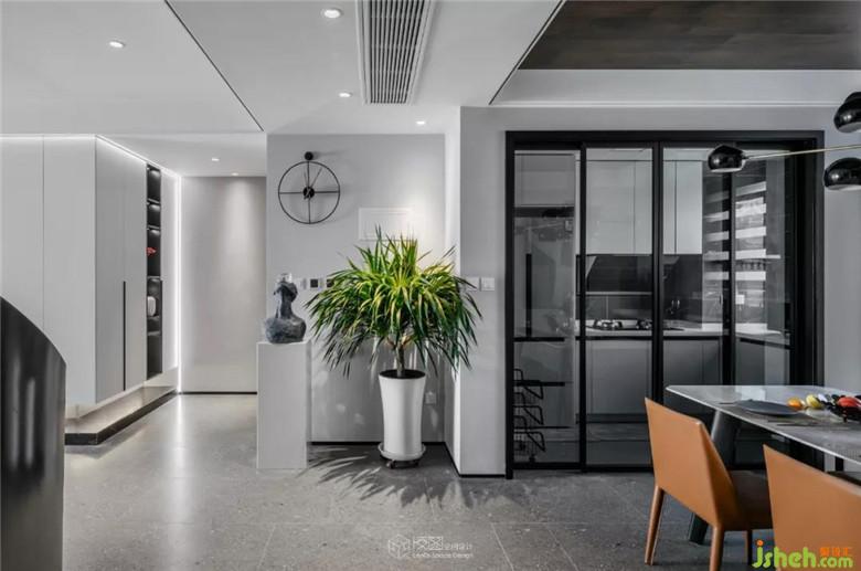 厨房通过黑色与浅灰色进行搭配,室内设计师利用合理空间定制出丰富的柜体,将厨房用具及杂物妥当收纳。黑框玻璃移门,使得这一空间在或封闭式或开放式两者之间自由切换,给人以简洁利落且通透立体的视觉效果。