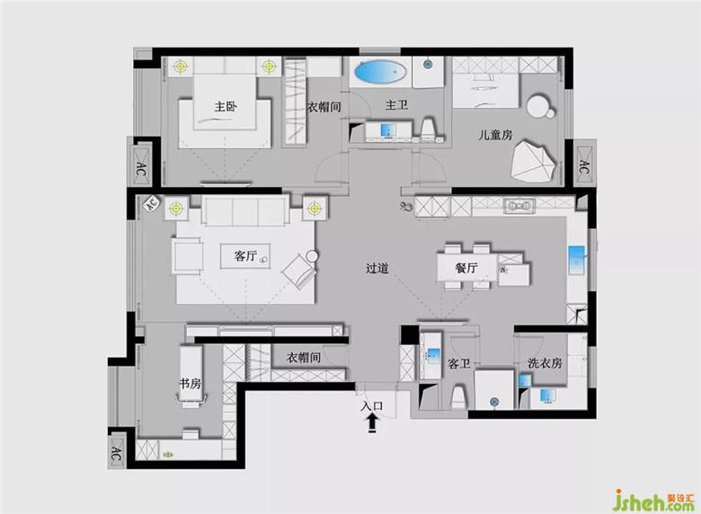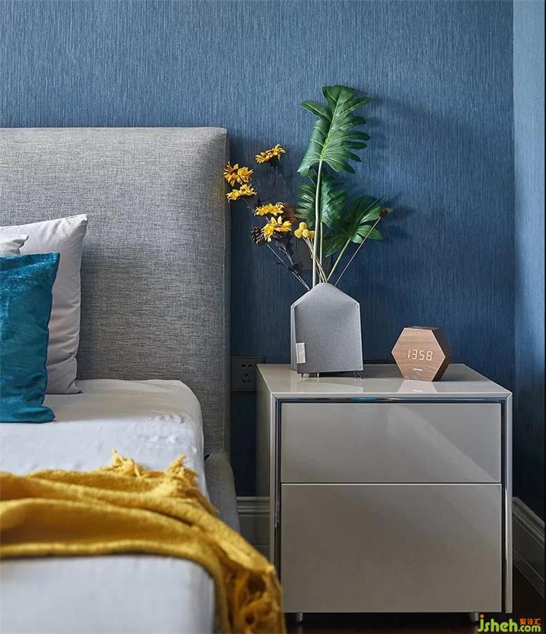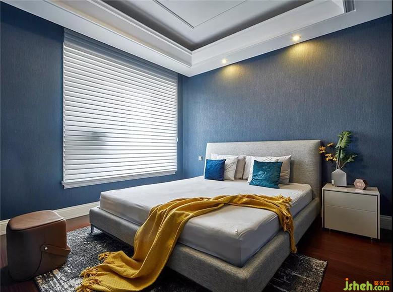 ▲主卧室的设计上,以简洁舒适为理念,蓝色带有纹路的壁纸,淡雅的床前地毯,以及暖色调的光源,柔和清新的百叶窗……无一不是旨为主人营造出一处舒适的睡眠环境。