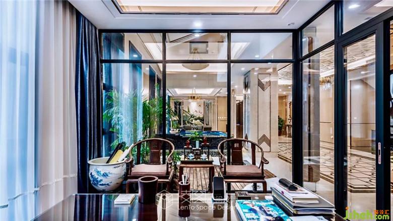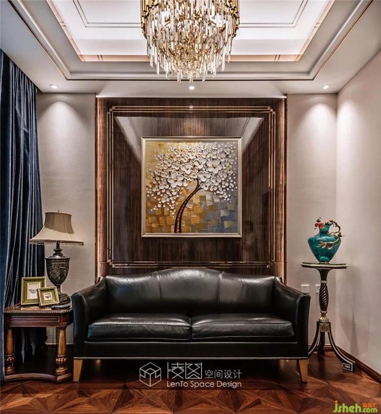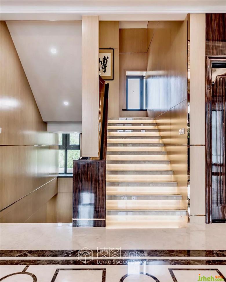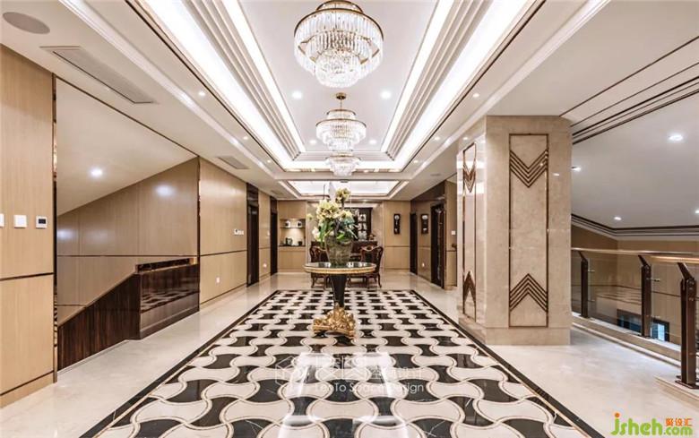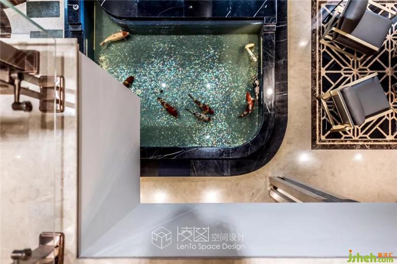 三层中厅,无论从材质,造型,色调,分区还是Art Deco元素的运用上来看,都紧密地与二层空间相互呼应。凭栏俯视,可以望到二层共享观景区的群鱼相戏,这种呼应的虚与实,显与隐相互作用,形成视觉与区域之间的互动。