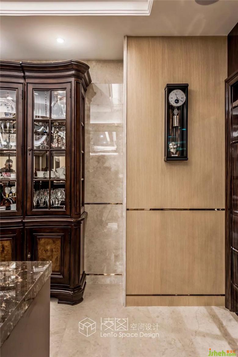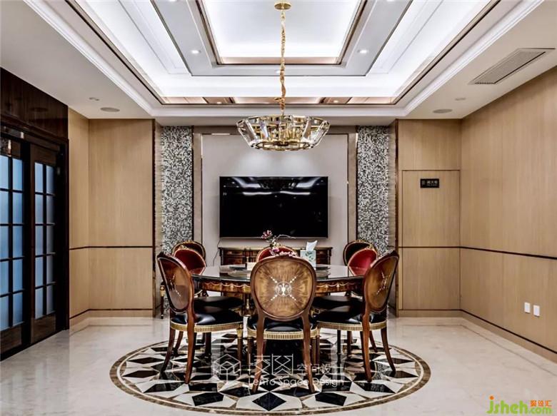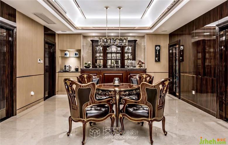 中厅与用餐区和吧台品酒区分别列于同一水平线上,设计师充分利用原建筑的空间层次,通过顶面设计造型和灯带的走向,采取明暗交叠、突出重点的手法丰富空间感,使得三个不同的功能区域既相互呼应而又相对独立。