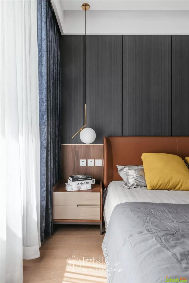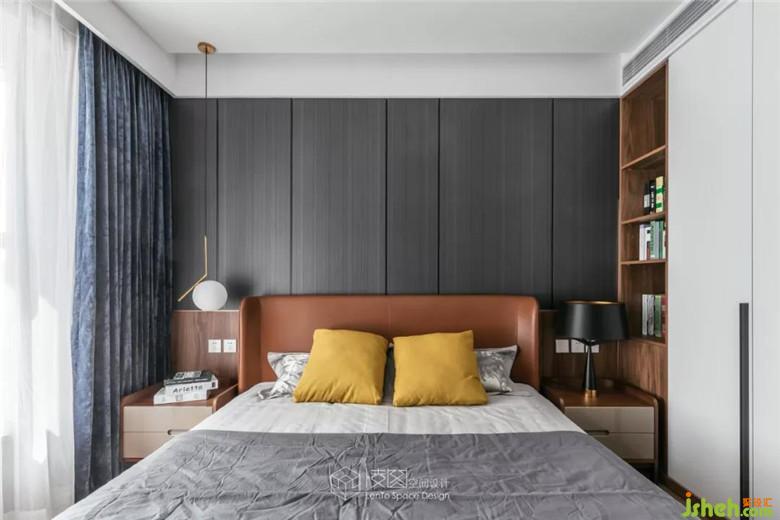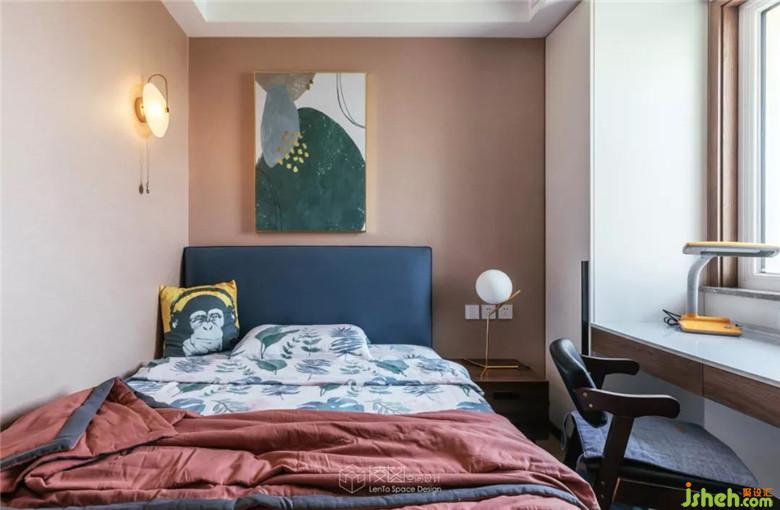 次卧空间相对狭小的前提下,室内设计师以窗为出发点,将衣柜、书柜、书桌三个功能硬件化而为一,最大限度地利用墙面空间,使得睡眠、学习、收纳的需求逐一实现。