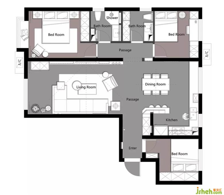 双卫生间区域经过重新整合,主卫被有效地独立出来,原本的客卫空间则担负起卫生间干区、生活用品收纳以及洗衣房的功能重担,结构与功能的互动更加多样化,充分满足了日常生活所需。