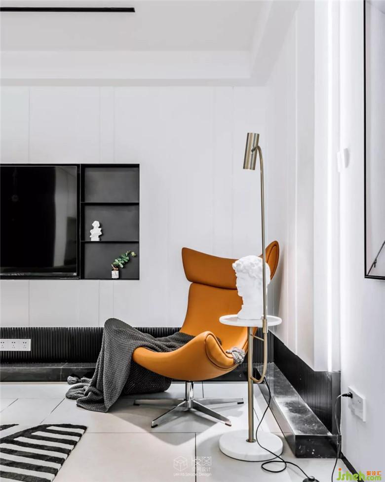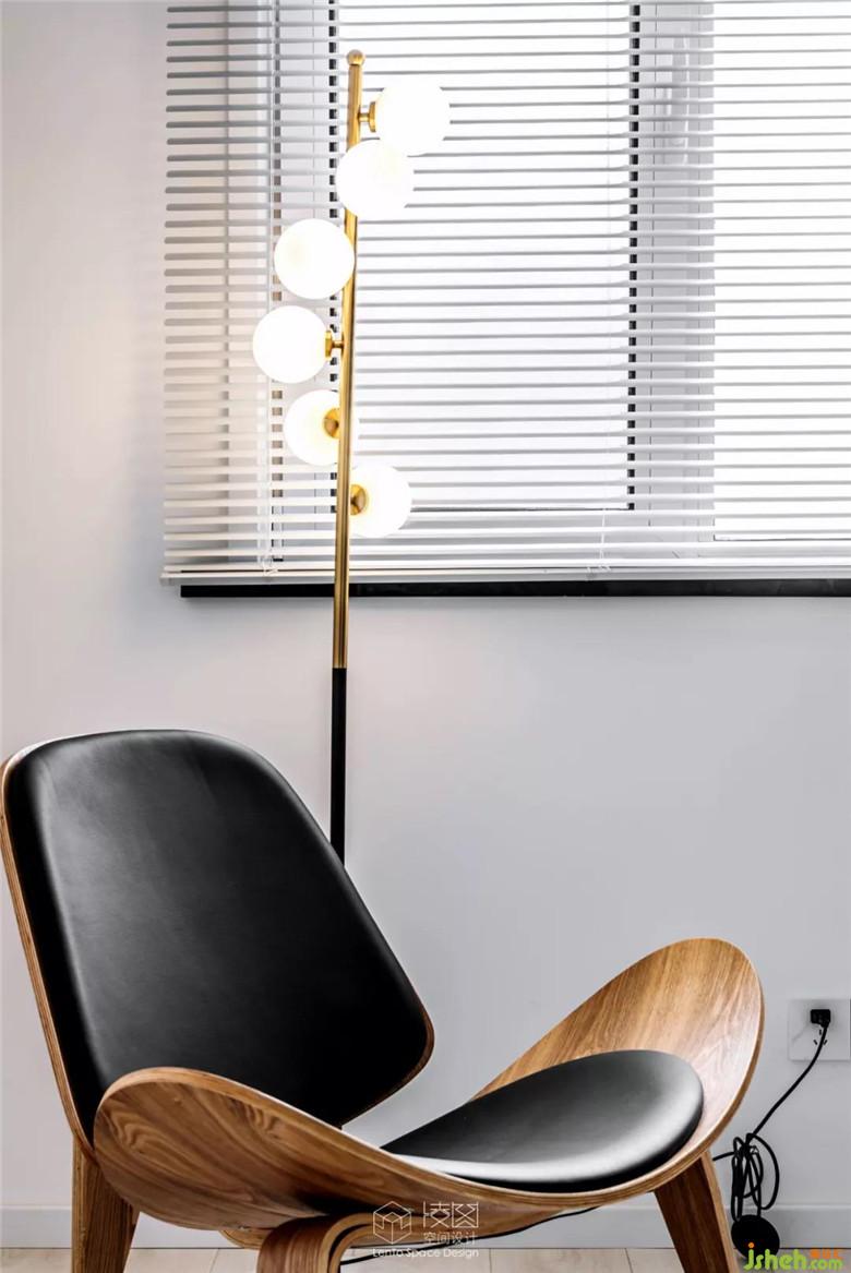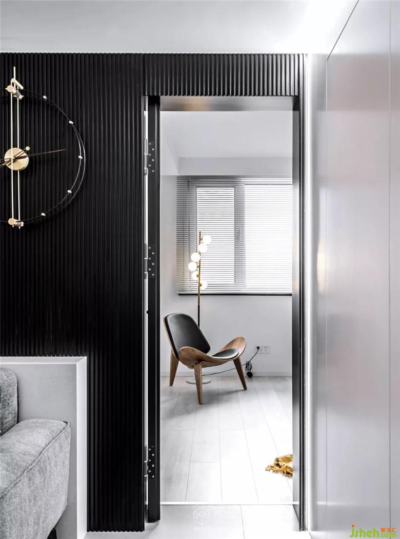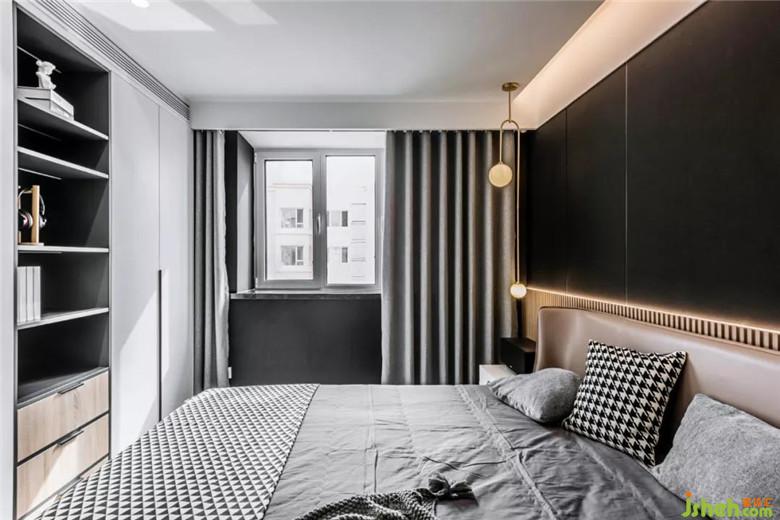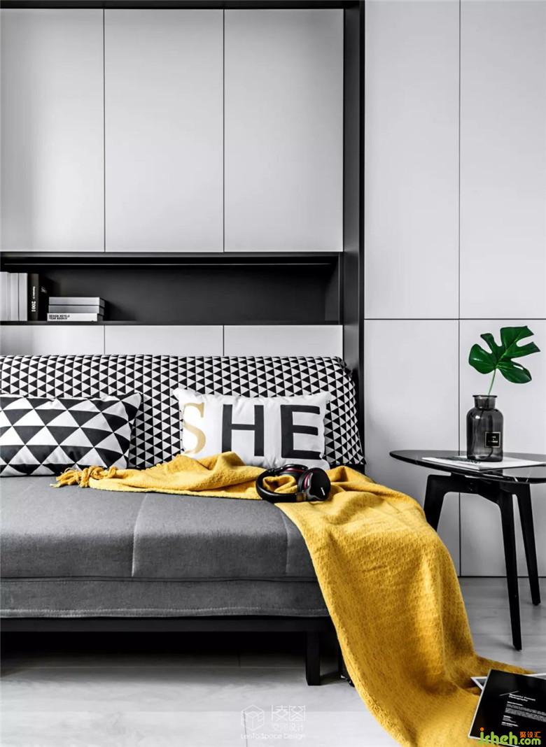 设计师将次卧室的门稍做了移动的处理,使得门后的墙面更加完整,并利用其打造出书柜,满足了业主闲暇时阅读的需求。