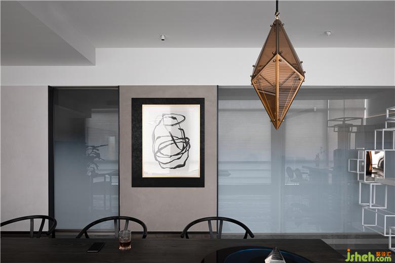 办公区与共享空间之间是一面丝印渐变玻璃,让办公区既能享受户外的景色与阳光,同时又具备一定的私密性,还避免了东向早上强烈的阳光照射。会议桌上宝石形状的吊灯又如金色水滴,下方的三色圆形亚克力组合装置彷如水滴泛起的涟漪,在灯下形成光影交错,办公室设计带动了空间的灵性。
