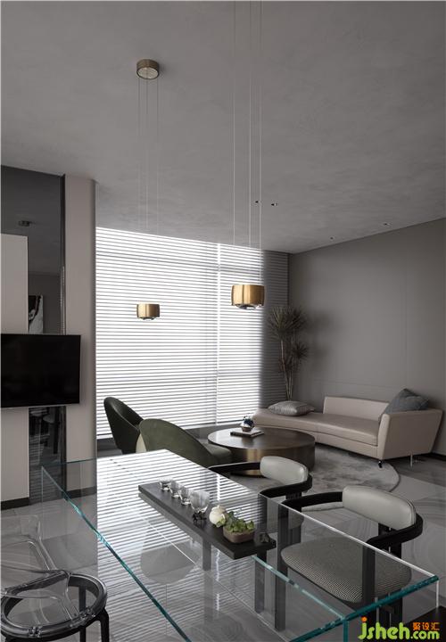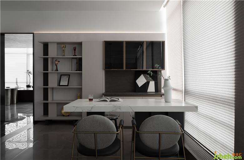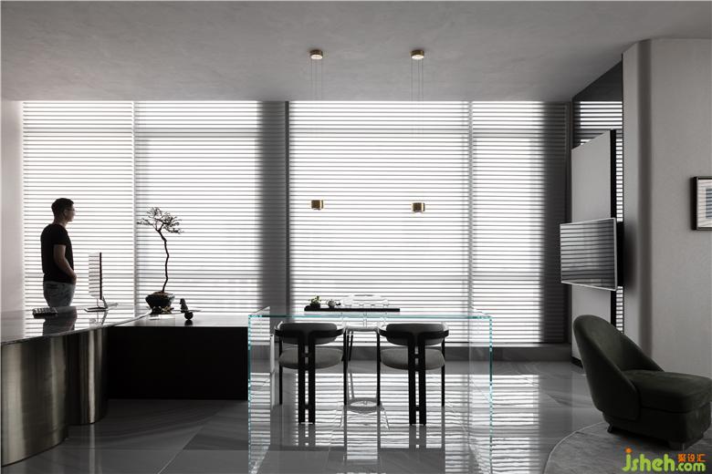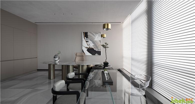总经理办公室营造的是一个简约轻奢又带有淡淡中式文化底蕴的空间,挂画、大班台石材台面、花瓶、地砖等表面波浪纹理形成了一种水墨流淌的气息,椭圆的大班台和圆形的茶几让空间更为柔和亲切,超白玻璃茶台搭配简约的原石茶具,还有造型精致的德国原装进口OCCHIO小吊灯,让整个空间显得干净而且统一,随着百叶状香格里窗帘除除升起,窗外开阔的景观跃然眼前,置身其中,有一种忘却浮世繁华的宁静。