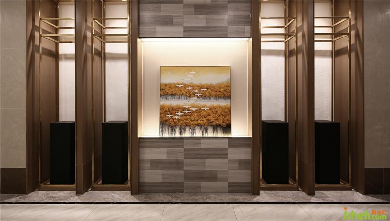 走廊区域还兼顾了工艺品及企业文化、酒品的展示功能,而圆形的竹子透景,使空间增添了宁静的意境。结合局部金属线条,让出入粤宴楼的来宾感受到了尊贵的体验感。
