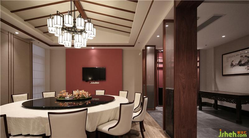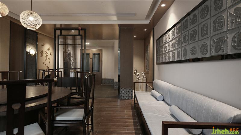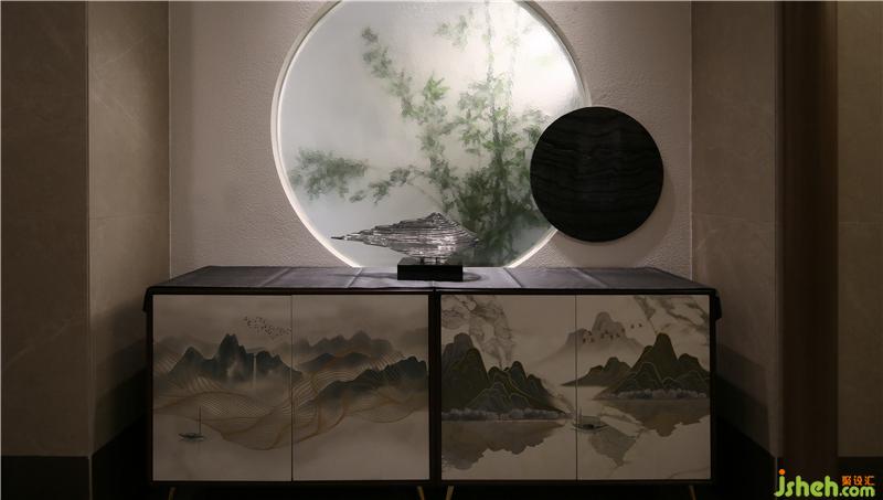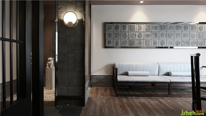 砖红色墙体与造型斗柜形成了独特的装饰角落,具备了实用性,还充满了静态之美,深宅旧院的岭南温婉形象立于每个人的眼前。仿古青砖拼凑成一幅幅烟雨岭南中的大气恢弘,并与空间内的每个岭南元素形成了互动,彰显了岭南地区赋予生于此长于此的文人身上所独有的儒雅书生气质。