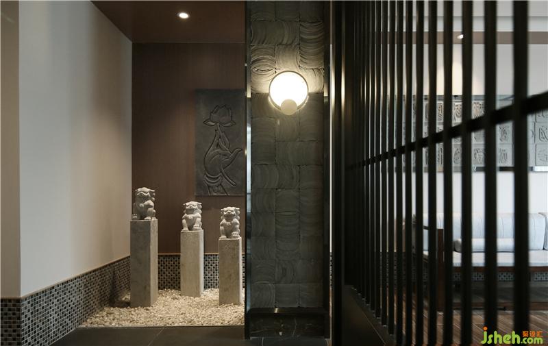 富有岭南建筑特色的仿古立瓦条造型墙身,配合上干景区域的狮子形态造型柱强调了岭南文化的核心。人们印象中陶艺工艺品都是冰冷端庄的,因此餐厅设计师将更容易近人的木色融入其中,让富有历史感的佛山陶艺元素回归到宁人放松的休闲氛围中。