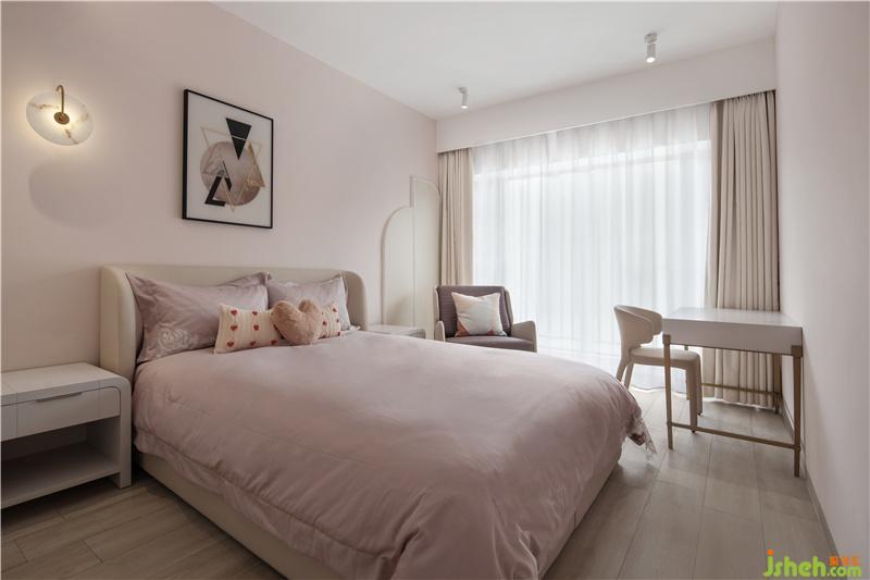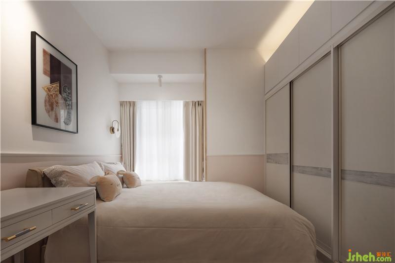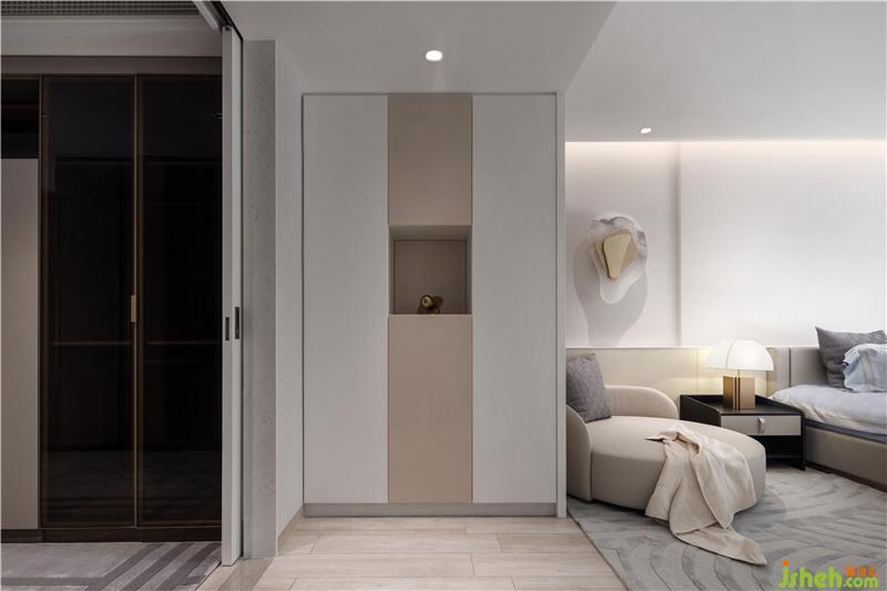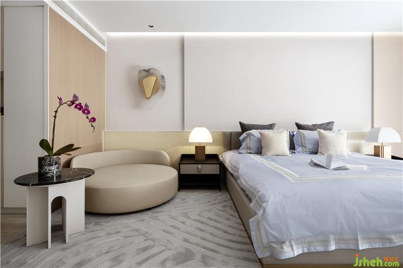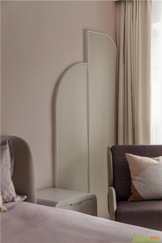 主人房继续沿用了女主人偏好的简约淡雅色调,并与过道形成了风格上的延伸关系。