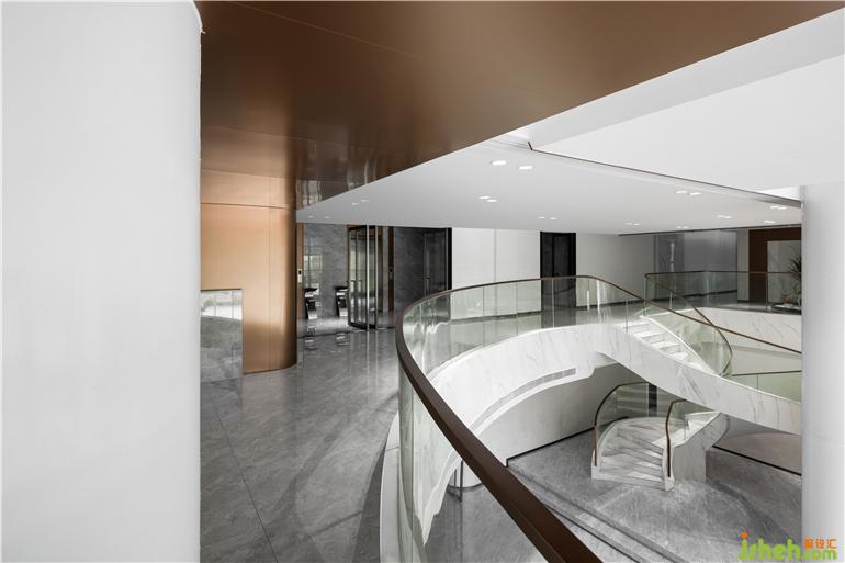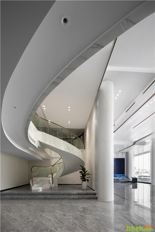 并以律动感十足的旋转楼梯衔接夹层的洽谈及招商办公空间,