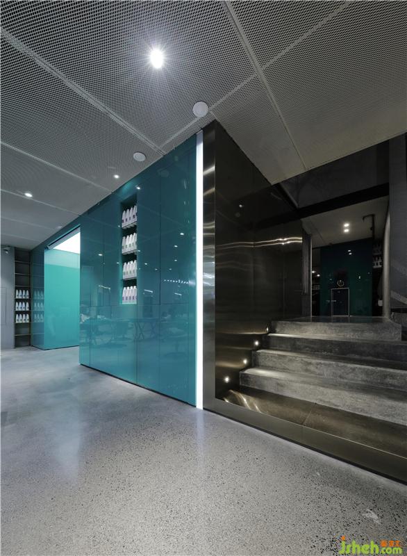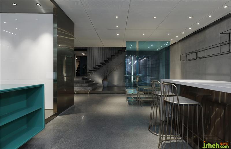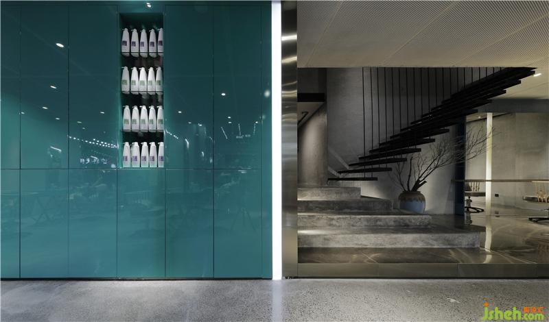 歌剧舞台概念的贵宾区,用一个强烈的L型金属体块划分出来,粗犷的水泥台阶、黑色的钢吊工业楼梯、淳朴的树枝陶瓶装饰、通透的蒂芙尼蓝玻璃隔断,组合在一起,颇有舞台场景的画面感。与之相邻的蒂芙尼蓝盒子中间用一条光带切割出空间的界限,独立又极富雕塑感。而在美发区又回归到原始淳朴的空间感觉,目的是为了让专业回归本源,安静的专心做一个属于自己的发型。装修设计