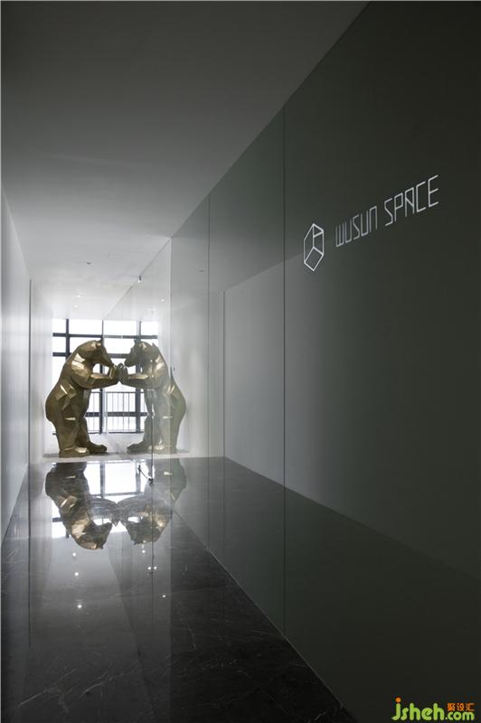 一道光门,隔开了外界的纷扰,拾阶而上,映入眼帘的是一头金色的熊趴在玻璃上向内窥望,这是致敬艺术家Lawrence Argent在美国Denver Convertion Center创作的蓝熊,它的趣味性打破了走廊的单调。办公室设计