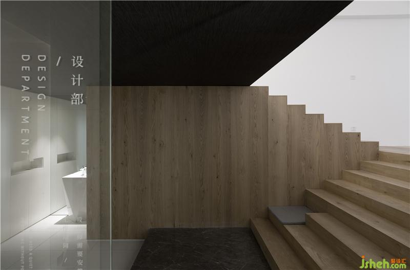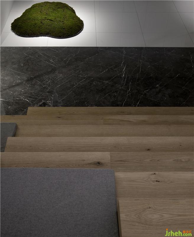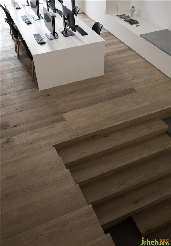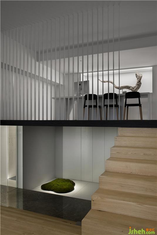 沿着光的指引,我们首先进入左边的空间,这是属于设计部的区域。温润的原木、空旷的白、冷峻的灰,还有那一角绿色的青苔,都能让心马上平静下来;为了让办公区得到更好的视野、光线和合理的空间比例,我们提升了办公区域的地面,办公室设计下面作为储物间和设备间,这样即丰富了空间的层次,又解决了收纳的问题;利用高度差,从入口到办公区域的楼梯设计成可休闲看书,可临时变成会议室的多功能区域;而办公区域上空悬吊着那条犹如艺术装置的物体,这是可根据功能需求、调节灯光色温和亮度的灯具,随着工作的心情变换工作的氛围。