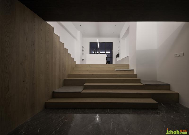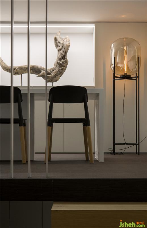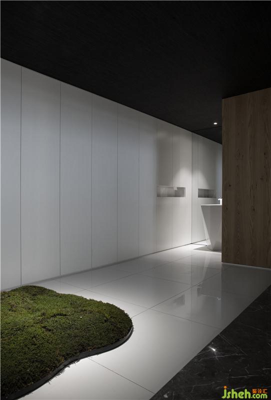 走廊的两条光线分别指引着两个不同区域的入口,右边的玻璃墙隐藏着工作室的LOGO,不开灯的时候,这是一堵干净的玻璃墙,丝毫看不出有什么特别;灰色的大理石地面像纽带一样,连接着两个不一样的空间。