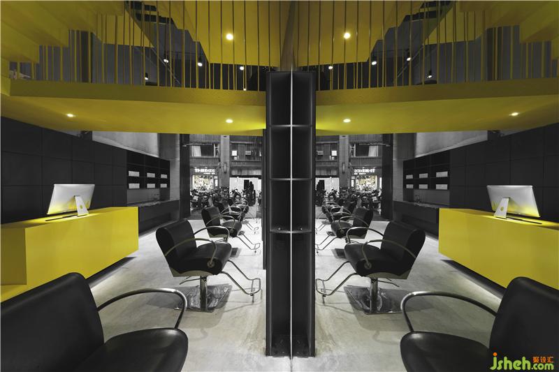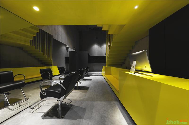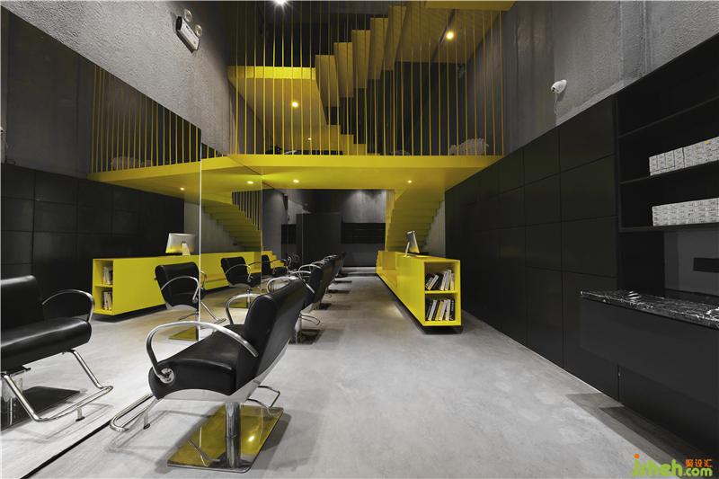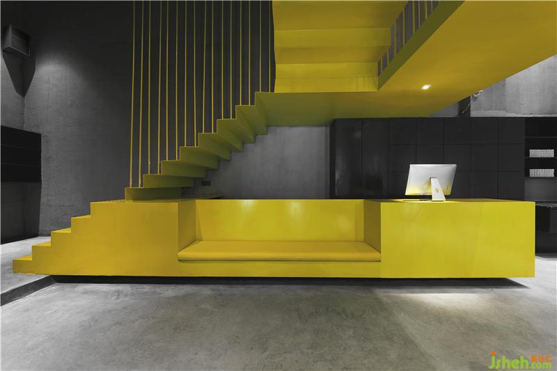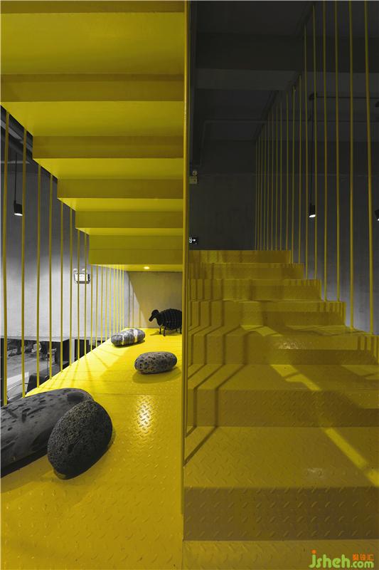 黑+黄是非常经典的颜色搭配,实际运用在生活中的各种场景,既有时尚意味又有强烈的视觉冲击力。于是,所有功能性的器物、墙面、地面、顶面都为黑灰色,而楼梯装置则刷成了黄色。没有特意多余的造型堆砌、用最基础的结构,通过颜色的对比,把楼梯的装置感体现出来,成为空间视觉焦点。装修设计