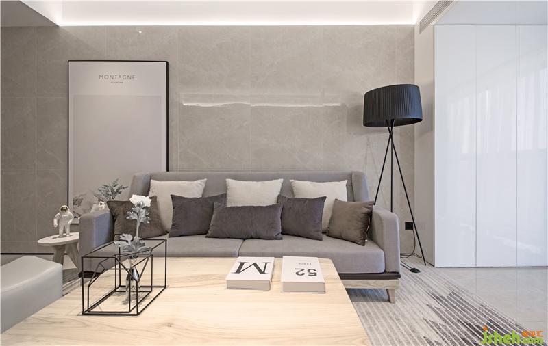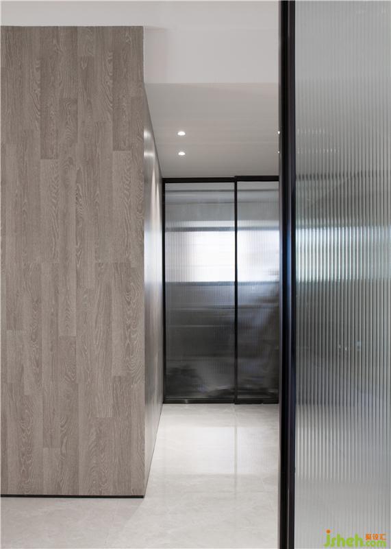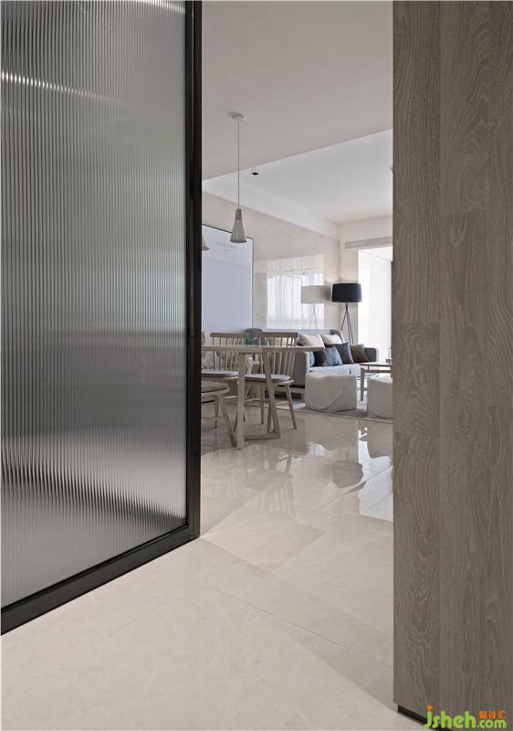 洗衣区和入户玄关之间设置了一个浮雕玻璃推拉门,以保证洗衣区的独立和私密性;厨房区域由四扇浮雕玻璃推拉门组成,可根据需求变成开放式和封闭式厨房;为保障厨房功能的完整,把冰箱嵌入储藏间墙体内,外部设立了一扇推拉门,即是冰箱的隐藏门,室内设计师又是进入休息区走廊的隐藏门,而表面采用与墙体一致的材质,也是要解决电视背景墙宽度比例不够协调的问题,以最大限度的保持空间体块的视觉统一性;阳台扩充出去的面积,做了两面收纳柜,供客厅休闲区使用。室内设计师