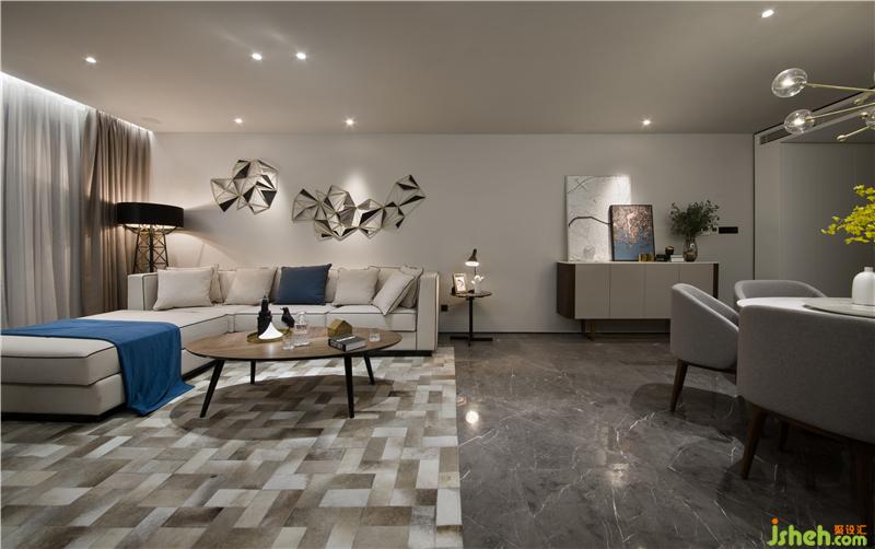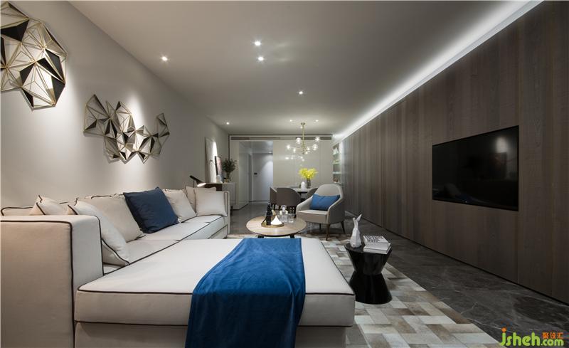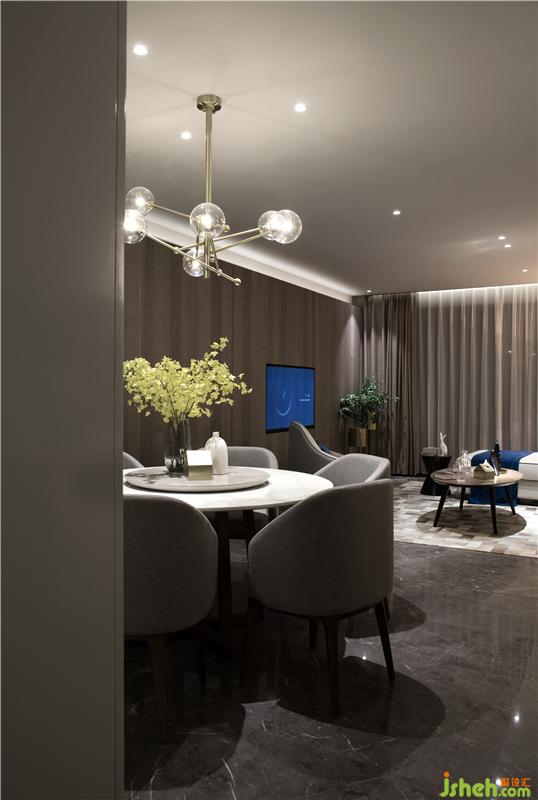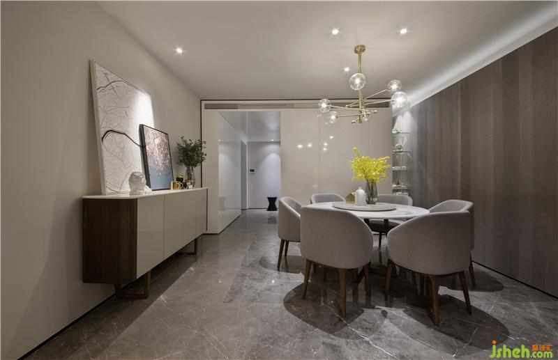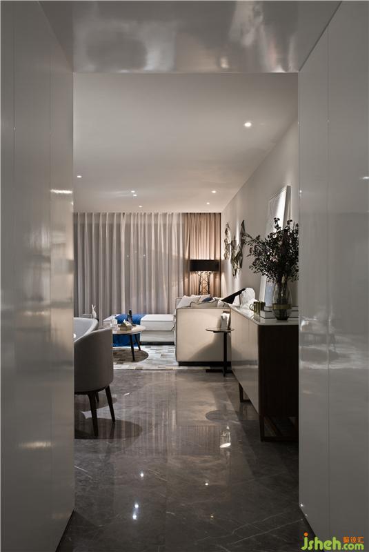 以电视墙隔开活动区和休息区,为了增大活动区的视觉空间,活动区的门全部以隐藏的形式。从客厅往厨房方向看,玄关和厨房融为一体,形成一个白色的盒子,成了这个空间的视觉焦点,而活动区的所有空调设备全部隐藏在白色盒子内,最大限度的抬高客厅及餐厅的层高,避免压抑。电视背景墙与休息区入门及餐厅背景墙做成一体,让活动区更加整体。室内设计师