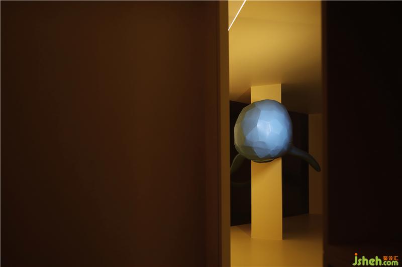 天光引入、扩散,切割着空间,幻化着视界。沿着黄色扩散的方向,一头蓝色鲸鱼迎面游来,与窗户的光产生了互动,也让空间的立体关系变得微妙。装修设计