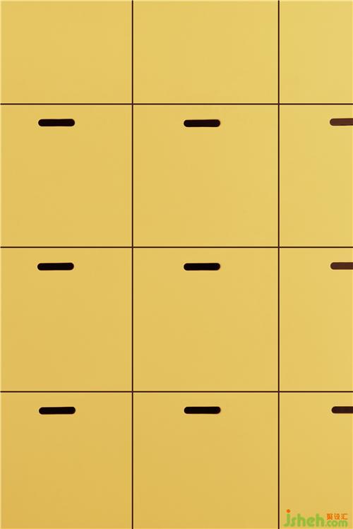 在平滑墙面的另一侧,隐藏着六个推拉展示柜和分享会使用的凳子,展现了强大的收纳和展示功能。凳子融合了产品、功能、美学艺术为一体的产物,看上去就像以直觉和想象力水到渠成的抽象派艺术,是这个空间不可或缺的移动元素。